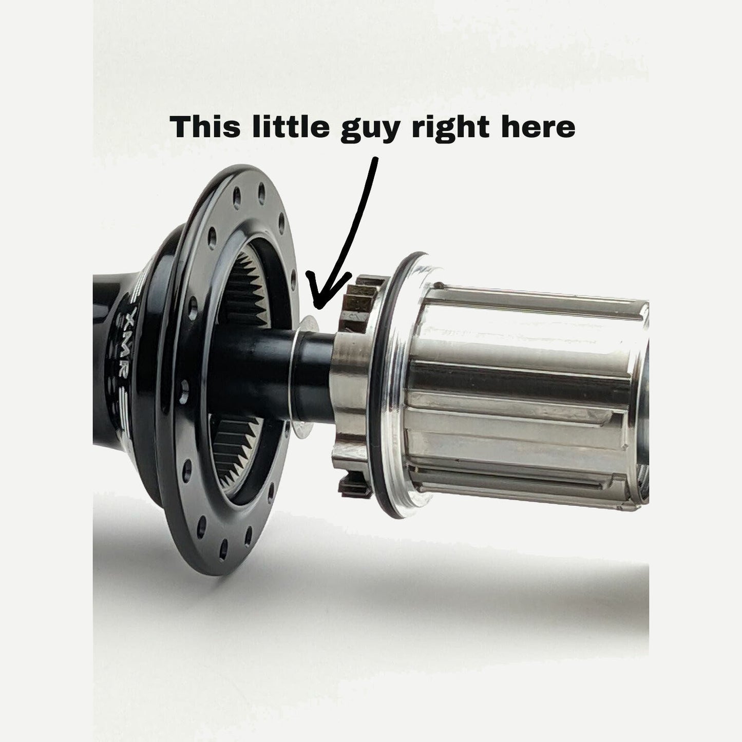 This thrust washer goes on the hub axle, between the hub shell and freehub body. Without it, the hub will not spin freely and you can severely damage your hub.  It’s easy to lose when rebuilding your rear hub and not a bad idea to have on hand in case it ends up under your work bench!